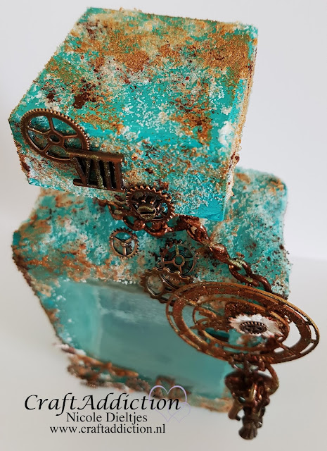 Tevens verwerkte ik de Rusty Patina Kopergroen op de embellishments.